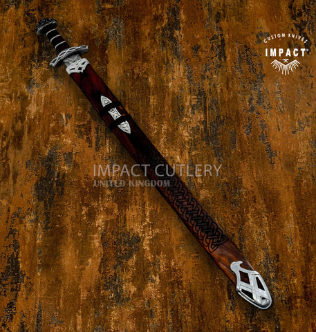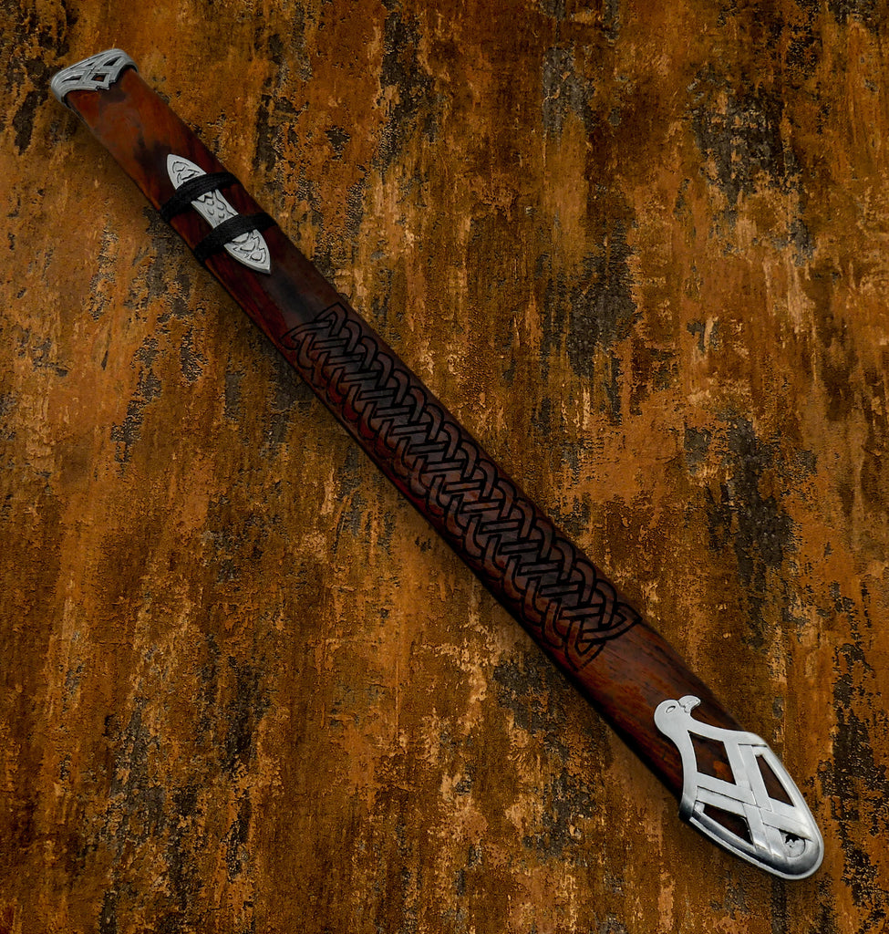 - Scabbard: Hardwood with hand-carved knotwork, leather wrapping, and steel fittings featuring an eagle-head chape — a symbol of power and freedom.