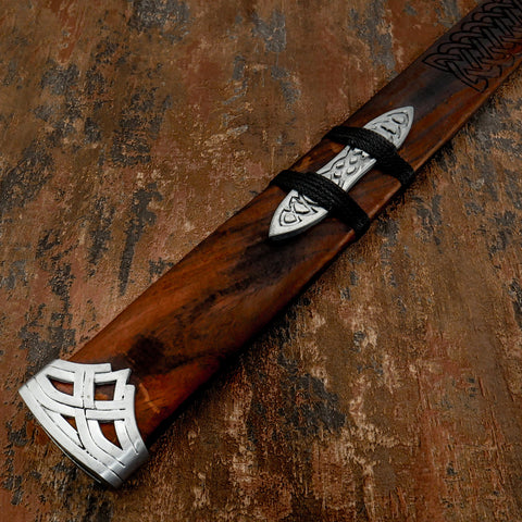 - Handle: Dark hardwood grip with polished steel spacers, capped with a lobed pommel engraved in Norse knotwork.